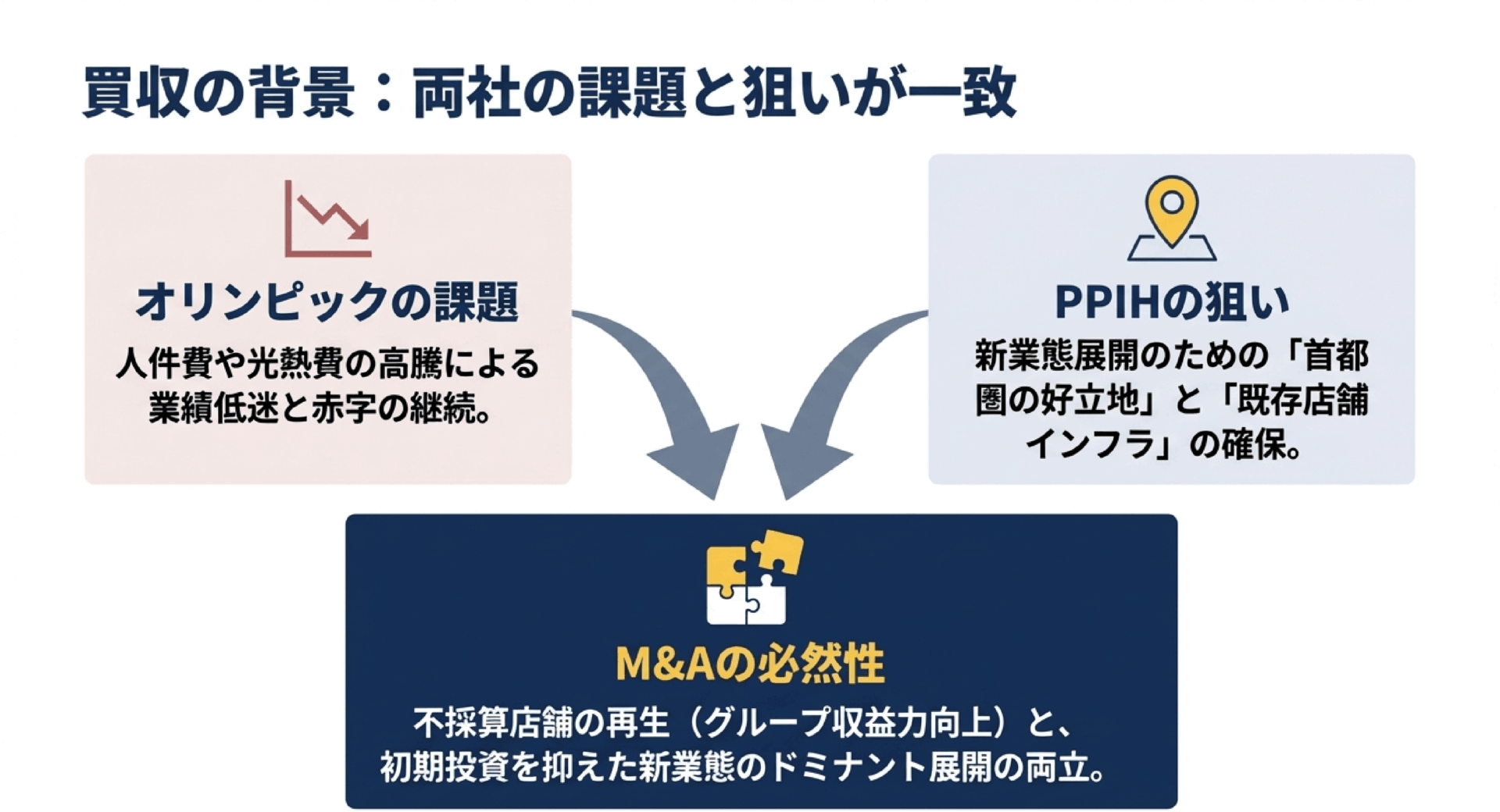 当初はPPIH傘下のユニーが展開するスーパー「ピアゴ」の既存店の業態転換などで初期投資を抑える方針でしたが、今回のオリンピック買収により、首都圏でも同様の戦略が可能になります。