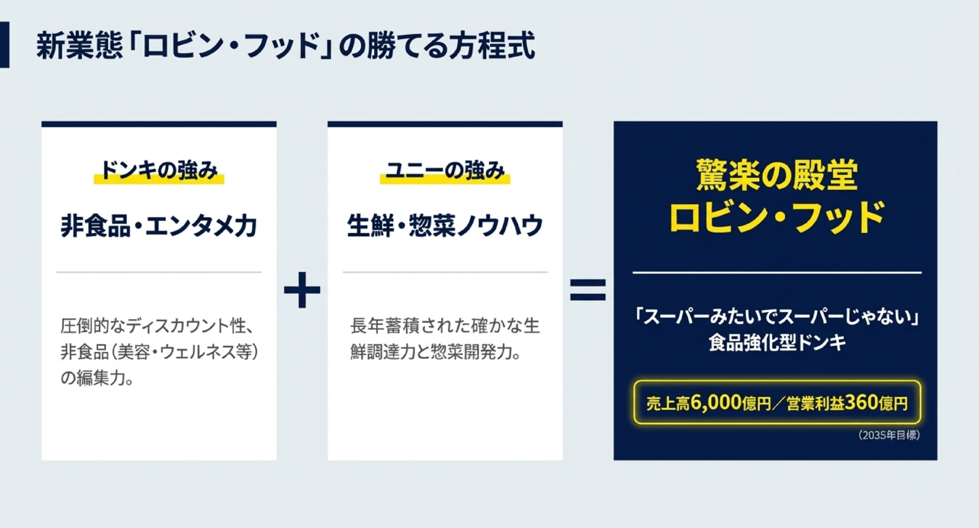 PPIH傘下のユニーはスーパーを展開し、長年にわたり生鮮調達力などのノウハウを蓄積してきました。これにドンキの棚作りや非食品による高い収益性・安定性、ドンキの”ディスカウント性”をかけ合わせるのがロビン・フッドです。