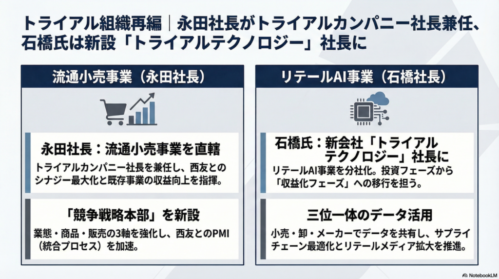永田社長がトライアルカンパニー社長を兼任することで、流通小売事業の陣頭指揮を直接執り、西友とのシナジー創出を加速させる。一方、リテールDX事業は石橋体制で分社化し、収益化フェーズへ移行させる。